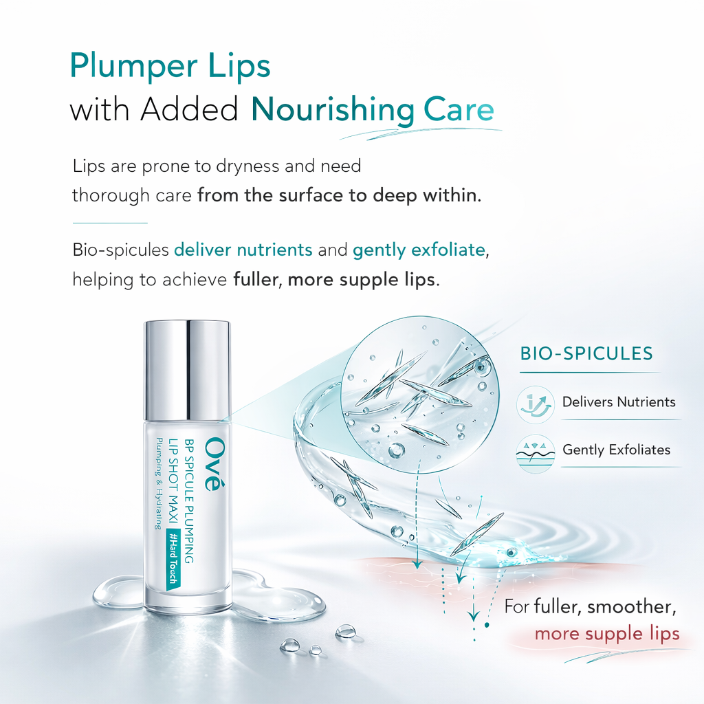 Ové Lip Shot uses tiny, invisible structures called spicules that gently work beneath the surface of your lips. They create small channels in the skin, allowing key ingredients like hyaluronic acid and peptides to sink deeper and boost volume from within — giving you real, visible plumpness in just 10 minutes.
